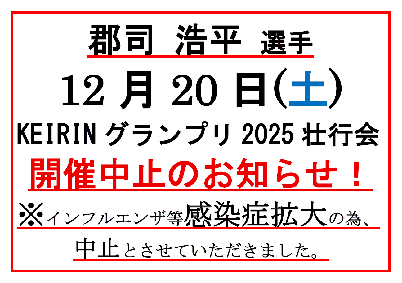 12月20日(土)に予定しておりました郡司 浩平 選手 KEIRINグランプリ2025壮行会ですが、 インフルエンザ等の感染症が流行っている状況から判断をし中止とする事になりました。 楽しみにされていた競輪ファンの方々には申し訳ありあせんが、郡司選手の感染リスクも 考えた結果ですのでご理解頂ければと思います。 また別の機会に郡司選手に来場頂ければと考えております。 ご理解の程、よろしくお願い致します。 ← 【サテライト横浜】12/7(日)競輪YouTubeチャンネル「Hidekazuの競輪channel」撮影会 &予想会開催!! 【サテライト横浜】12/20(土)競輪YouTubeチャンネル「Hidekazuの競輪channel」撮影会 &予想会開催!! →