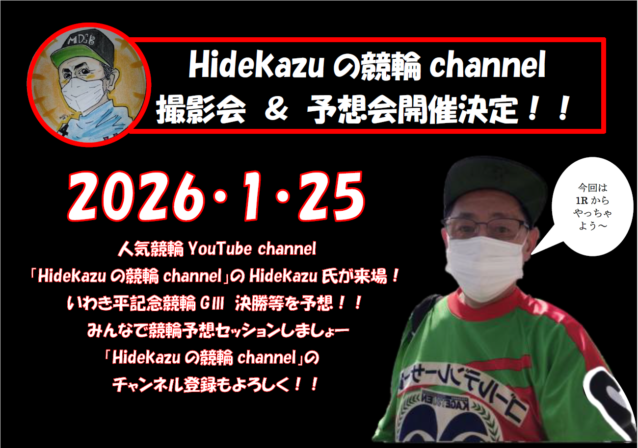競輪ファンの皆様こんにちは!! 最強寒波襲来で寒いですね~🥶 皆様、元気に競輪されてますか? 体調崩されてないですか?! 1/25(日) いわき平記念競輪GⅢ 4日目!! 人気競輪YouTubeチャンネル「Hidekazuの競輪channel」のHidekazu氏が来場され、 いわき平記念競輪GⅢ決勝等の予想を行います!! 皆様のご来場、心よりお待ちしております!! ← 【サテライト横浜】1/17(土)競輪YouTubeチャンネル「Hidekazuの競輪channel」撮影会 &予想会開催!!